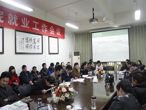 2014年就业工作会议在A4-222召开。学院院长岑岗、党总支书记苗红亚、院长助理骆钧炎和全体教师参加了会议。会议由苗红亚主持。