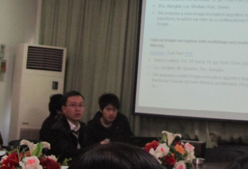12月13日下午,av影片 物理系“格致论坛”第十六讲在A4-222会议室举行。宁波大学周星飞博士和浙江农林大学汪小刚博士应邀为论坛作学术交流报告。报告会由物理系主任王长荣教授主持,物理系、实验中心相关教师和应用物理学部分高年级学生参加了本次论坛。 会上,汪小刚博士、周星飞博士分别就“光学图像的编码及隐藏”、 淀粉样多肽聚集的原子力显微镜研究作了专题报告,介绍了自己近年来在该的相关研究成果,并和与会师生就相关专题进行了讨论。