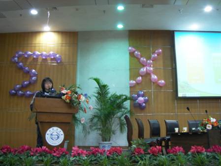 06信计2班的朱婧文登台亮相。她首先向与会人员介绍了我校美丽的自然风光,接着介绍了我校近三年参加数学建模竞赛取得的成果和数模协会活动情况。朱婧文通过大量的图文资料将我校近年的活动进行了展示,如数模专家刘康生的精彩讲座、2008年协会招新、数学建模的培训,还介绍了参加数学课程学习的体会和学习理念等,她的发言赢得了阵阵的掌声。会上,我校2008年数学建模竞赛国家级一等奖获奖者、电气学院林芳也介绍了她参加数学建模过程的体会,并就我校在数学建模竞赛培训方面的情况与兄弟院校的学生进行了交流。
