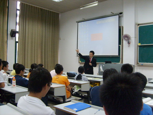 在A3-117为大四学生作了一场题为“如何迈向成功”的讲座。由资深经理人、行销总监朱力中主讲。