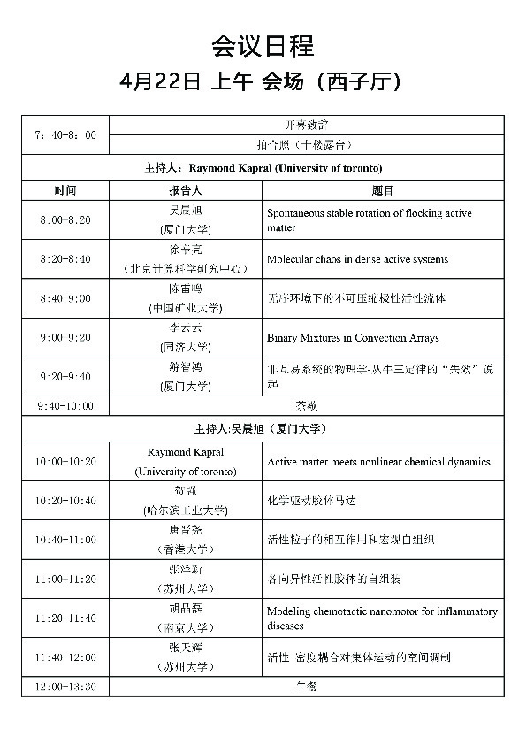 本次会议由杭州师范大学、浙江科技学院、中科院物理所联合主办旨在促进基础统计物理的发展,推进原创性科学的发现,并寻求从基础到应用的跨越会议汇集全国此领域内的众多知名学着,瞄准学科前沿和发展趋势,研讨学术、交流思想、分享经验,聚焦非平衡系统中涌现的有趣现象,发掘深层次的非平衡态统计物理基本规律,加深对生命体系的理解,并促进活性软物质在生物、医学、材化等多学科的应用。会议日程如下: