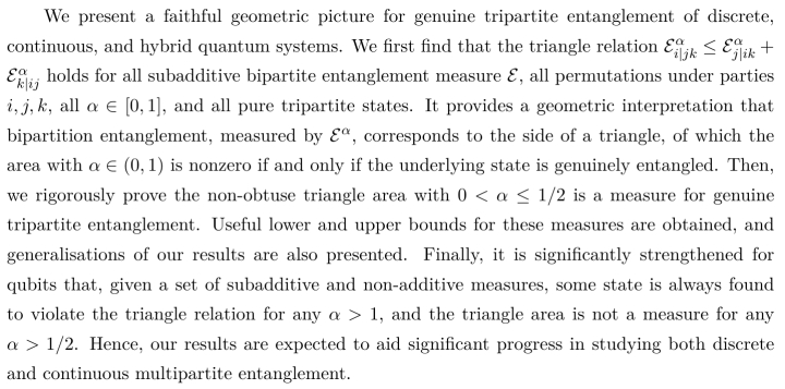 一、报告题目:Faithful geometric measures for genuine tripartite entanglement