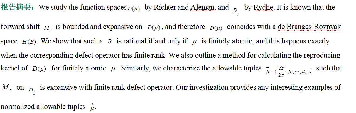 一、报告题目:Dirichlet-type and n-isometric shifts in finite rank de Branges-Rovnyak spaces