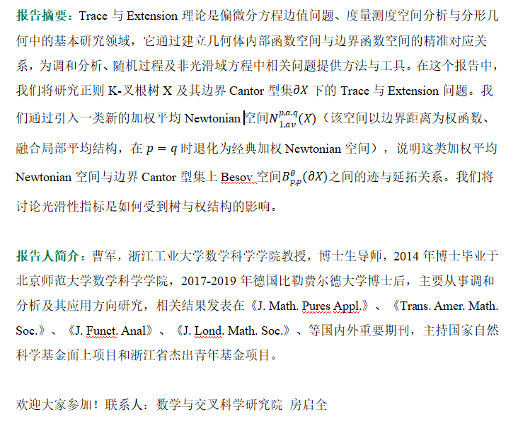 一、报告题目:Trace and Extension Theorems for Weighted Averaged Newtonian Spaces on Regular Trees